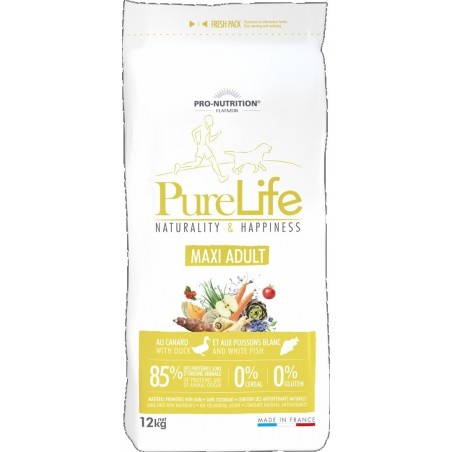 PureLife Maxi Adult est une alimentation équilibrée et complète pour les chiens adultes de grandes races. Convient également aux chiens sensibles. Il s’agit d’une alimentation au canard et au poisson blanc contenant 85 % de protéines d’origine animale, c'est une recette sans céréales et sans gluten.