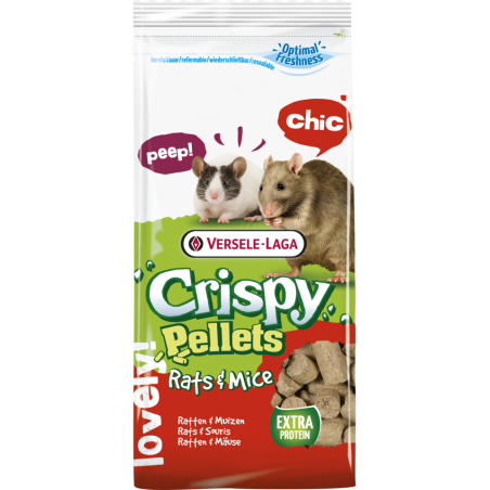 Crispy Pellets de Versele-Laga, un aliment complet en granulés et riche en protéines pour rats, souris, et autres rongeurs omnivores. Les granulés tout-en-un excluent l'alimentation sélective.
