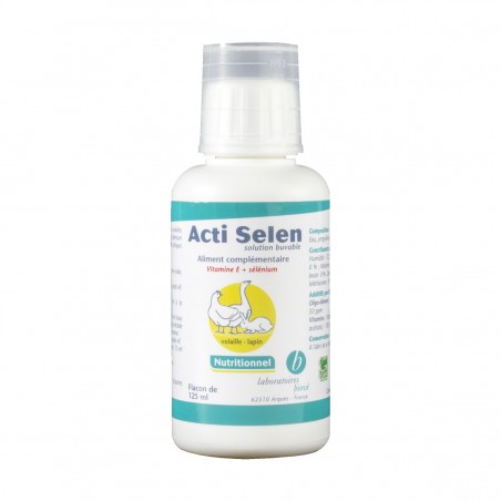 Acti Selen est un complémentaire buvable en vitamine E + sélénium pour les bovins, ovins, caprins, porcins, volailles et lapins, recommandé lors des périodes où les besoins sont accrus : sevrage, phases critiques de croissance.