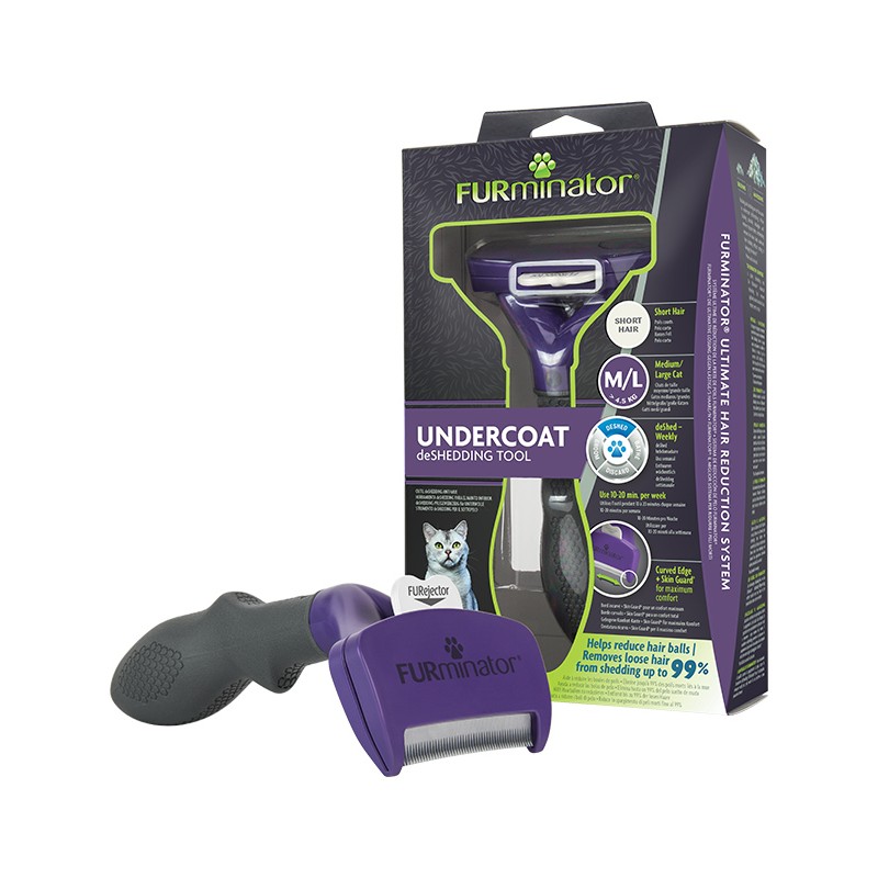 La brosse FURminator Undercoat deShedding anti-mue pour chats élimine jusqu'à 99 % des poils morts liés à la mue.