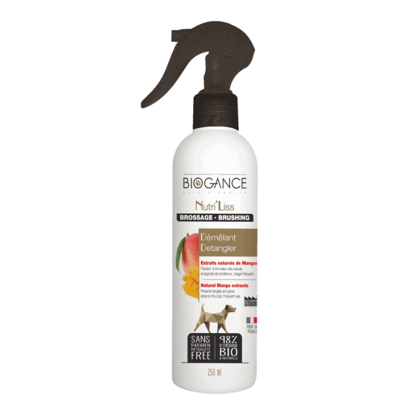 Le démêlant antistatique Nutri’Liss est formulé à base d’extraits naturels de mangue. Il nourrit, gaine et apporte de la brillance au pelage.
